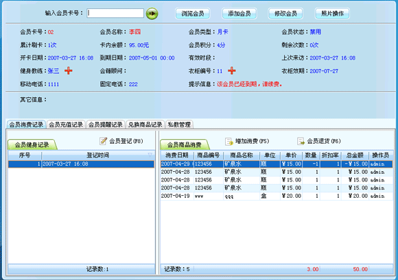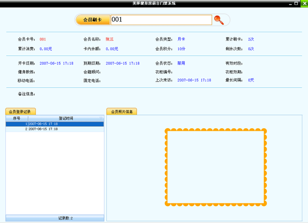 會員刷過卡后會顯示出該會員的基本信息,如果該會員卡到期或該會員請假等特殊情況,系統(tǒng)會有提示。界面左下角顯示的是該會員登記的記錄,右下解顯示的是該會員的照片。
