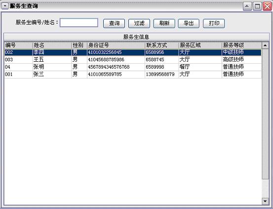 服務生設置:服務生是指能為賓客提供服務的本店員工,在此設置中可增加、修改、刪除服務生信息,還可為每個服務生設置相應的服務生等級(例如:高級技師、中級技師、普通技師等)。有了服務生等級可在商品項目中為每種服務項目所對應的服務生等級設置相應的提成金額(如果有此需求),此項設置可為賓客提供服務的服務生自動計算提成金額。