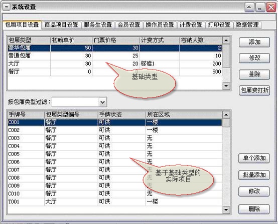 包廂項目:包廂項目也可以理解為包廂的種類(例如可分為豪華包廂、普通包廂等)。具體到某個包廂類型都有其相對應的手牌,而每個手牌就具體到某一來店登記的賓客,一般把手牌提供給一個客人后,在當前客人未退出占用狀態前暫時無法提供給另一個客人消費。此項目在系統設置中設置,在賓客開單時使用。