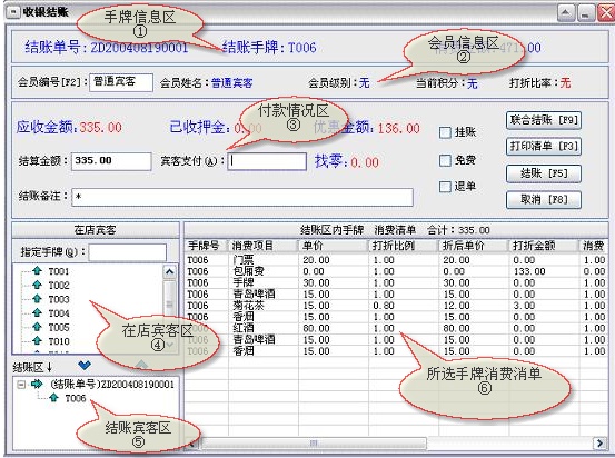 收銀結賬→賓客結帳:終結客戶當前的消費活動,并進行收款及自動還原包廂項目(手牌)的占用狀態為可供狀態。