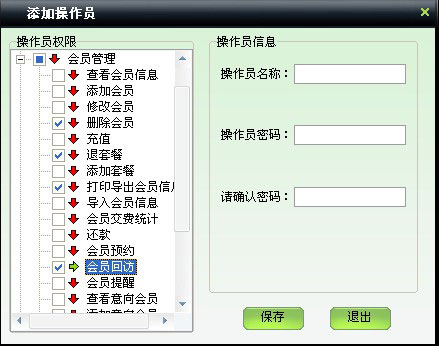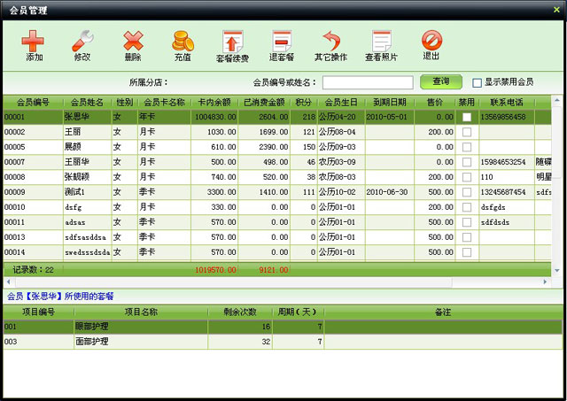 | 包括會員基本信息的管理,如添加、修改、刪除會員,充值,套餐續費,退套餐,導入導出會員信息,查看會員照片等 | |