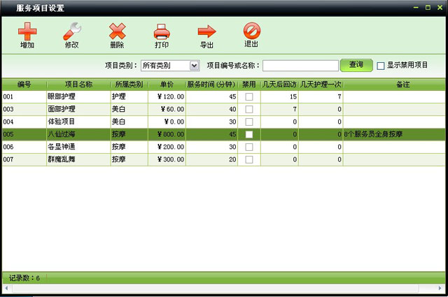 | 服務項目,也叫護理項目,可設置服務時間、回訪日期、護理周期等。 | |