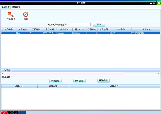 在學員管理中點擊“事件提醒”進入事件提醒界面如圖: