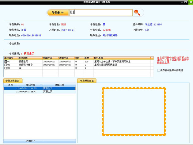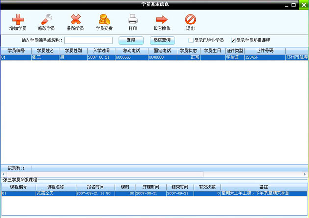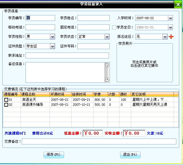 該窗口分兩部分:上邊是錄入學員的基本信息,下邊可以選擇學員所報的課程和交費情況。