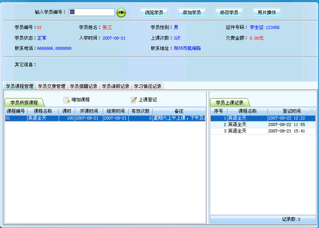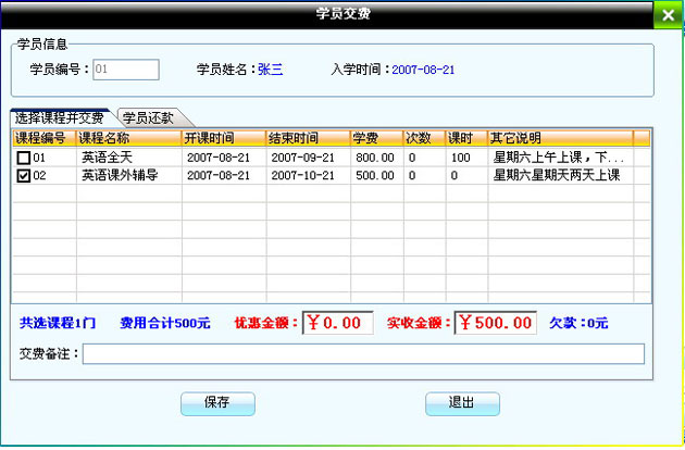在該窗口中選擇學員所報課程,并錄入學員的交費情況即可。