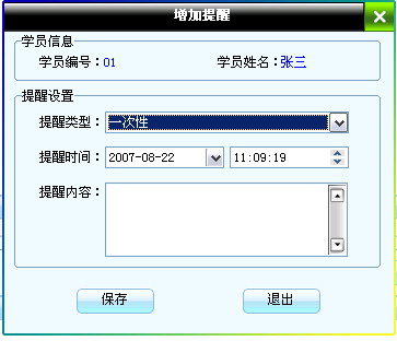 在窗口中上半部顯示的是所有的學員,下半部顯示的是當前選中學員的提醒記錄。選中一個學員然后點擊“添加提醒”打開添加提醒窗口如圖: