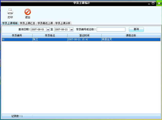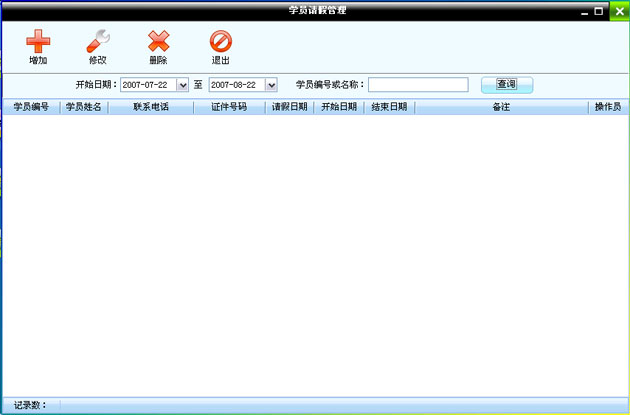 在該窗口中顯示的所有請假的學員,可以點擊增加按鈕來添加學員請假記錄。在學員請假的這段時間內該學員是不能上課登記的。