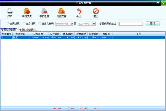 在該模塊中可以查詢到當天,當月和自定義日期的學員交費記錄和學員欠費記錄。在上邊工具欄中的“批量交費”功能是可以根據情況選擇多個學員進行交費。