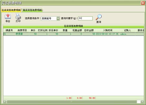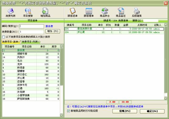 點單消費→增加消費:客人在消費過程中所消費的所有項目均要進行入帳處理,以便在客人離店時自動計算消費額。客人的消費明細便是在此入帳。