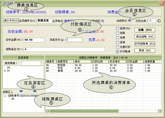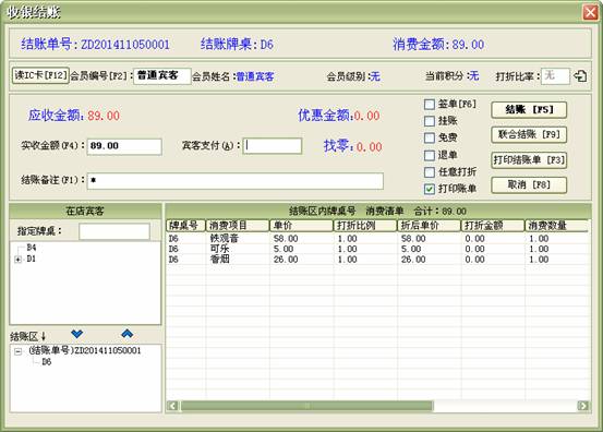 收銀結賬→賓客結帳:終結客戶當前的消費活動,并進行收款及自動還原房間項目(牌桌)的占用狀態為可供狀態。