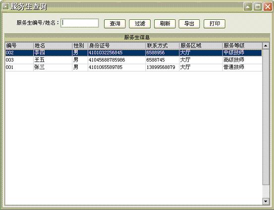 服務生設置:服務生是指能為賓客提供服務的本店員工,在此設置中可增加、修改、刪除服務生信息,還可為每個服務生設置相應的服務生等級(例如:高級技師、中級技師、普通技師等)。有了服務生等級可在商品項目中為每種服務項目所對應的服務生等級設置相應的提成金額(如果有此需求),此項設置可為賓客提供服務的服務生自動計算提成金額。