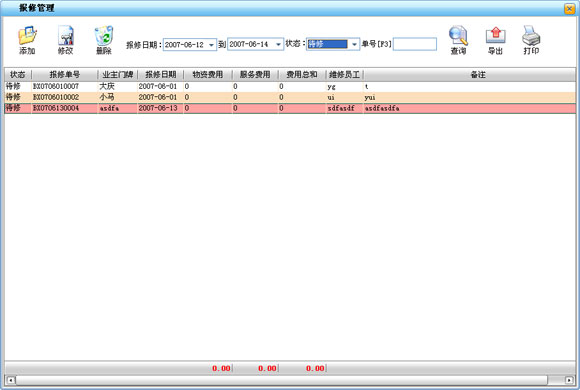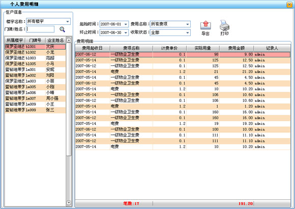 ·個費用明細用來查詢單個業主在一段時間內的物業費明細,可分別查詢一段時間內業主的未交物業費、已交物業費和所有以交未交的物業費。對查詢結果可以打印導出。