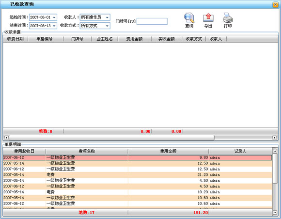 ·主要用來查詢物業收費管理人員的收費情況,以明確在一段時間內某個收費員的收費金額和明細。做到有據可查。