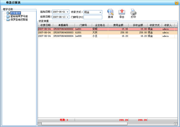 ·用來查詢每天或一個時間段內的物業收費明細,可按不同的樓宇查詢也同時查詢所有樓宇的收費情況。