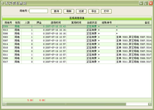 • 進入“來賓信息查詢”窗口,如果在“場地號/賓客姓名”后的文本框中輸入想查詢的場地號或賓客的姓名,點擊查詢即可在本窗口中的數據窗口中顯示出符合查詢條件的賓客信息。(可通過過濾指定查詢范圍)。