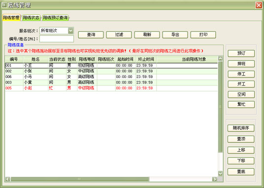 陪練設置:陪練是指能為賓客提供服務的本店員工,在此設置中可增加、修改、刪除陪練信息,還可為每個陪練設置相應的陪練等級(例如:高級陪練、中級陪練、普通陪練等)。有了陪練等級可在商品項目中為每種服務項目所對應的陪練等級設置相應的提成金額(如果有此需求),此項設置可為賓客提供服務的陪練自動計算提成金額。