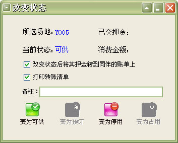 • 在選定需要修改場地狀態的場地后, 通過點擊菜單“來賓登記→場地狀態”(或通過右鍵快捷菜單中點擊“場地狀態”菜單項)進入場地狀態界面(如圖4)。 (注:只能對處于非占用狀態的場地進行此項操作)