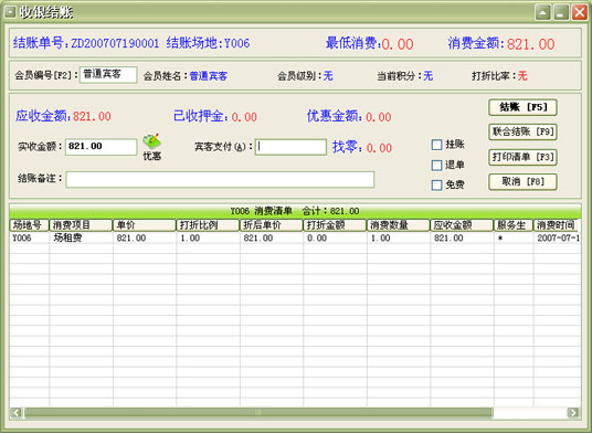 收銀結賬→賓客結帳:終結客戶當前的消費活動,并進行收款及自動還原場地項目(場地)的占用狀態為可供狀態(或清理狀態)。