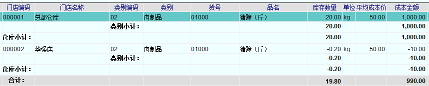 4) 庫存查詢:只有豬蹄(公斤)管理庫存,根據(jù)設(shè)置的轉(zhuǎn)換比率進行轉(zhuǎn)換,銷售2個豬蹄及銷售0.2公斤豬蹄,此時查看豬蹄(公斤)庫存為19.8: