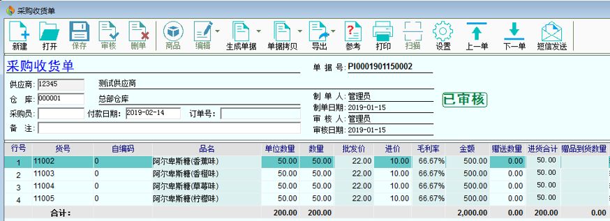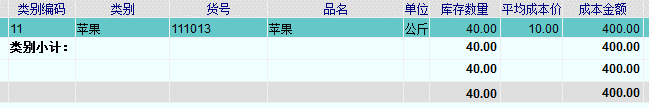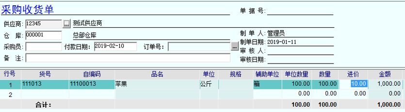 1) 采購入庫:如采購蘋果100kg,以進貨價10進行采購,采購金額共1000元,如下圖: