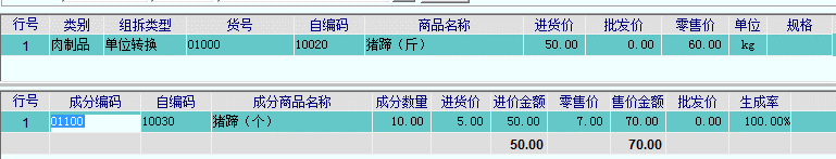 2) 商品管理:在“組合商品”中單位轉(zhuǎn)換商品豬蹄(公斤)的成分商品為豬蹄(個) ,且一般10個豬蹄重1公斤,成分?jǐn)?shù)量設(shè)置為10,如下圖: