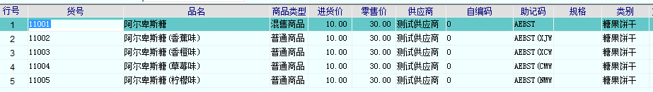 1) 商品建檔:在商品檔案分別建立阿爾卑斯糖(香蕉味)、阿爾卑斯糖(香橙味)、阿爾卑斯糖(草莓味)、阿爾卑斯糖(檸檬味)以及阿爾卑斯糖這五種商品,其中阿爾卑斯糖屬于混售商品,其余四種商品屬于普通商品,這五種商品的進價、零售價可設(shè)置為相同。如下圖: