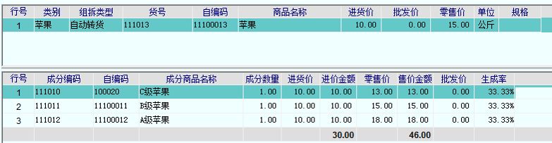 自動轉(zhuǎn)貨指一個商品需分成不同數(shù)量、價格銷售,且數(shù)量,價格不統(tǒng)一的多個成分商品。只管理原商品的庫存。
