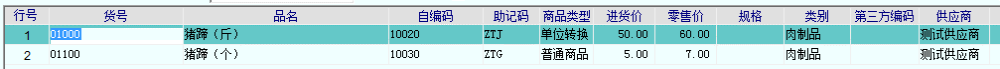 1) 商品建檔:在商品檔案分別建立豬蹄(公斤)、豬蹄(個)的商品檔案,其中豬蹄(公斤)商品類型為“單位轉(zhuǎn)換”,豬蹄(個)為“普通商品”。