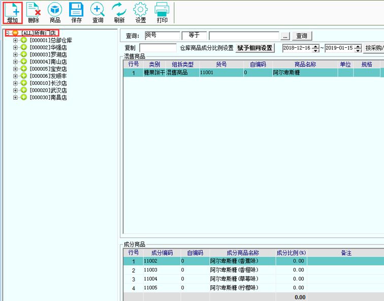 2) 商品管理:在“混售商品”中選擇“所有門店”,點擊“增加”依次錄入混售商品阿爾卑斯糖的成分商品為阿爾卑斯糖(香蕉味)、阿爾卑斯糖(香橙味)、阿爾卑斯糖(草莓味)、阿爾卑斯糖(檸檬味),如下圖: