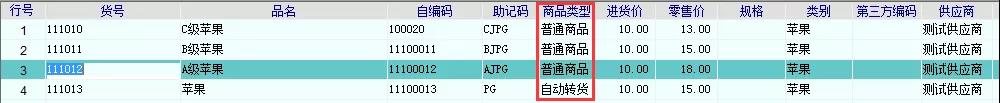 1) 商品建檔:在商品檔案分別建立蘋果、A級蘋果、B級蘋果以及C級蘋果的商品檔案,其中蘋果商品類型為“自動轉(zhuǎn)貨”,其他均為“普通商品”。注意A級蘋果、B級蘋果以及C級蘋果均需設(shè)置為不管理庫存。