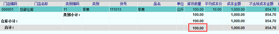 2) 庫存查詢:此時可查看到蘋果庫存為100kg,如下圖: