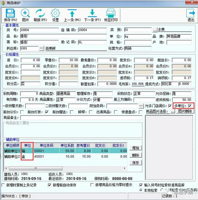 在總部后臺(tái)[基礎(chǔ)檔案]——[商品檔案]中添加香梨的商品檔案,單位為kg,在輔助單位中添加箱、盒單位,設(shè)定單位系數(shù)和參考售價(jià),勾選“多單位”選項(xiàng)。方式2的采購(gòu)入庫(kù)操作流程和方式1相同。