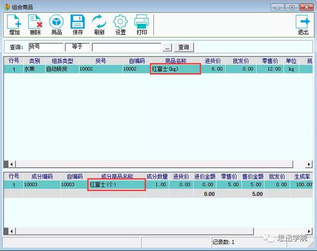 在[基礎(chǔ)檔案]——[組合商品]中定義好紅富士(kg)的成分商品紅富士(個(gè)),成分數(shù)量默認(rèn)即可。