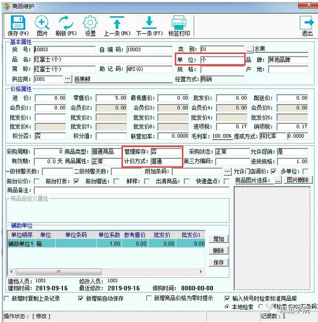 紅富士(個(gè))的商品類型是普通商品,計(jì)價(jià)方式為普通,不管理庫(kù)存,只管理紅富士(kg)商品庫(kù)存。