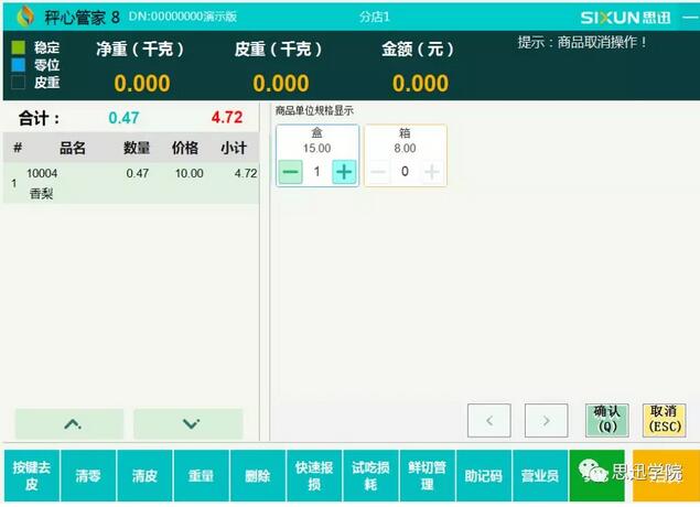 門(mén)店前臺(tái)銷售紅富士(個(gè))時(shí),需要先進(jìn)行稱重,點(diǎn)擊商品后彈出主商品數(shù)量輸入窗口,取到的重量是0.472,確定進(jìn)行銷售后,銷售數(shù)量為1,實(shí)際沖減紅富士(kg)0.472的庫(kù)存數(shù)量。