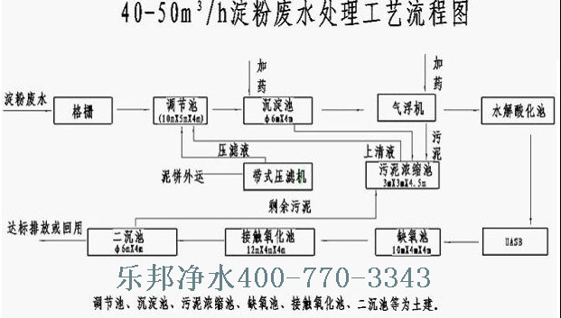 淀粉生產廢水本身含有機質多、濃度高且懸浮物含量大,廢水BOD5/CODcr=0.53,可生化性較好,同時在本工程中出水水質要求較高??紤]到以上因素,工藝選用物理與生化處理相結合的方式。物理法通過藥劑投加、絮凝氣浮工藝主要去除懸浮物、膠體物質及部分有機物,同時回收植物蛋白飼料。針對廢水本身有機物濃度高的特點,生化處理采用厭氧-好氧相結合的處理工藝。