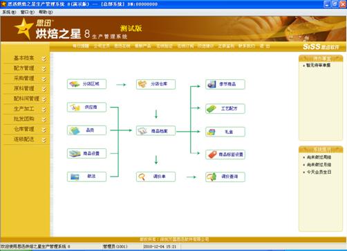思迅烘焙之星10專門針對面包糕點店、烘焙混合店設計的商業進銷存連鎖管理系統。滿足烘焙行業的原材料管理、商品BOM、生產加工、成本核算、商品銷售及預定管理。實現總部統一管理、中央工廠統一生產加工、門店銷售及生產加工的連鎖經營管理模式。